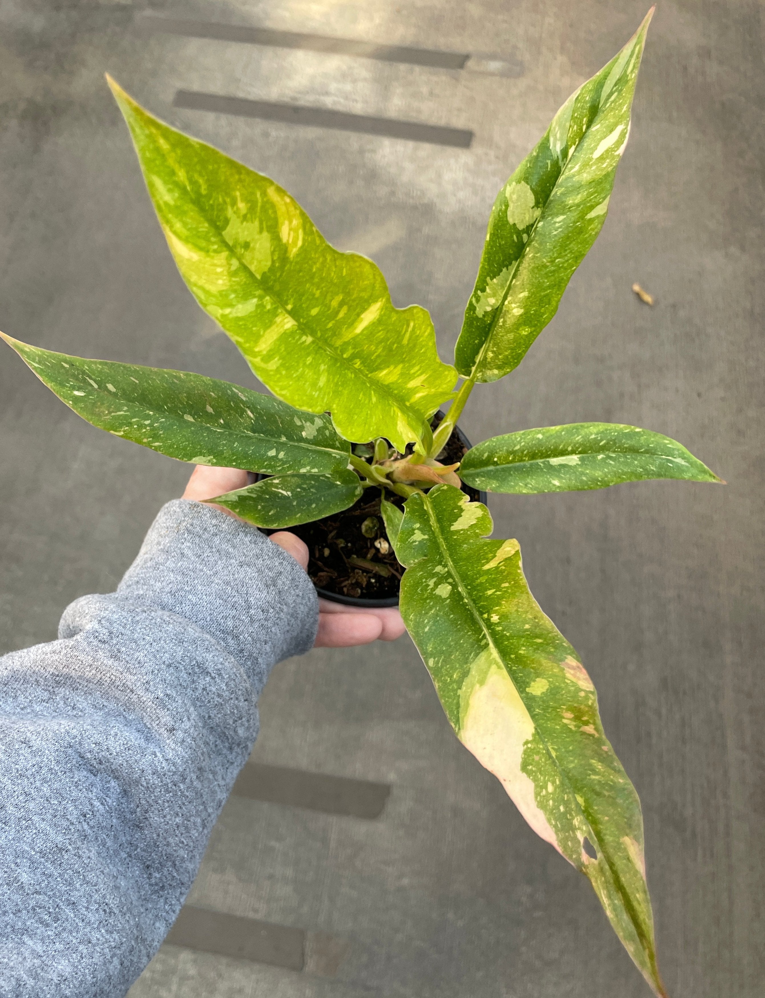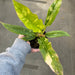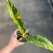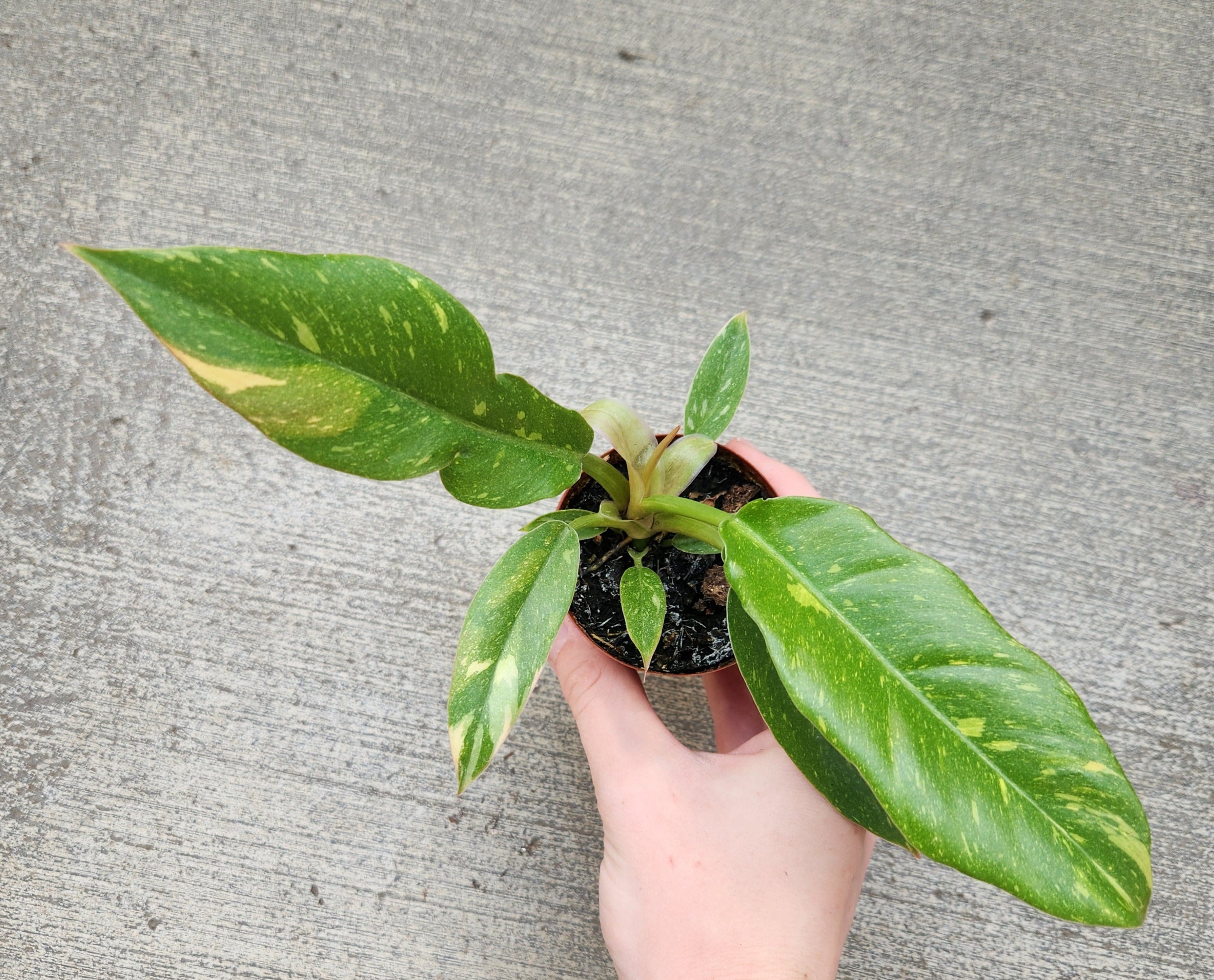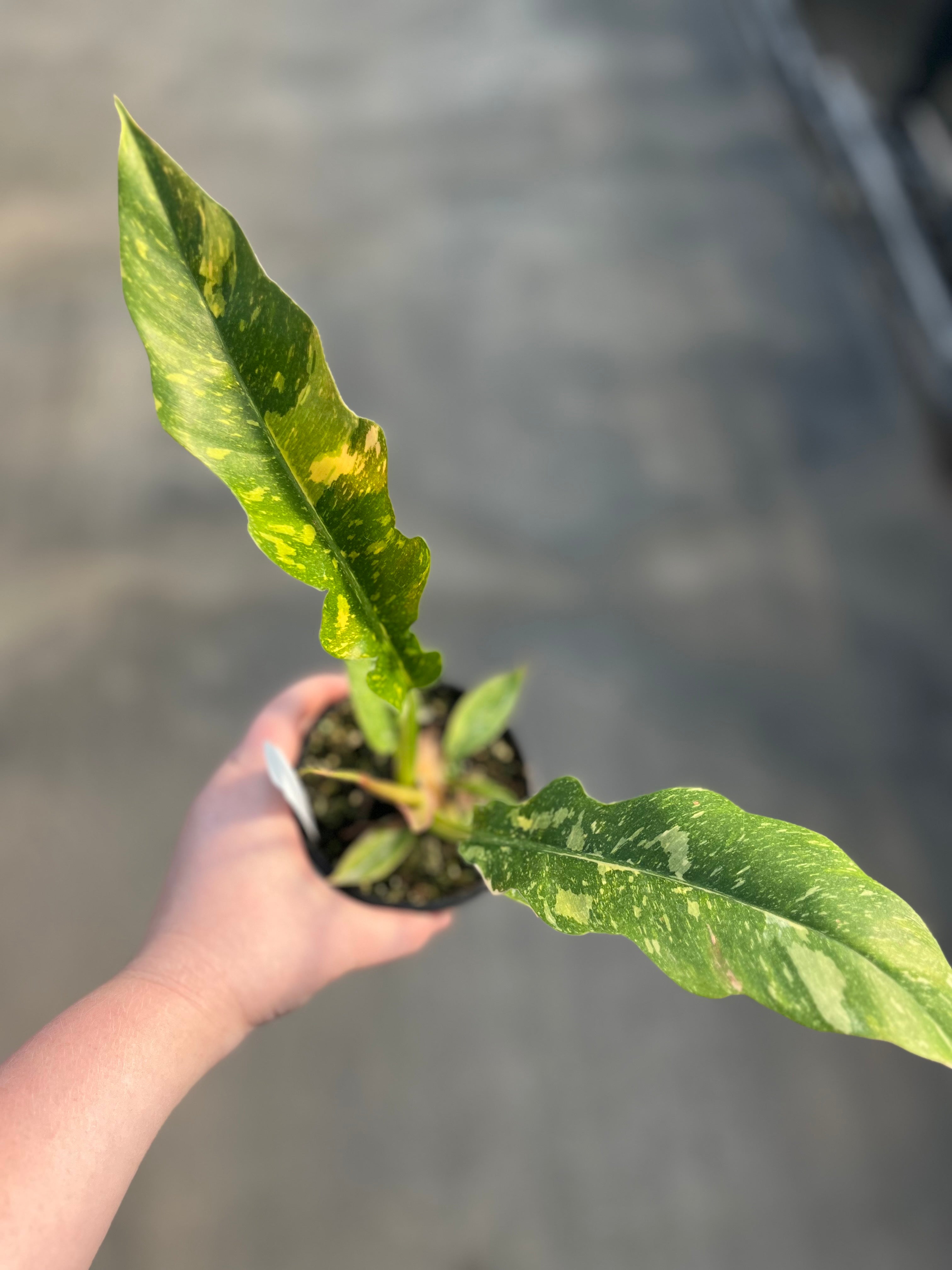 The Ring of Fire Philodendron has a long, serrated sawtooth leaf shape with a marbling variegation that gives it its name. The variegations are a combination of yellow, creamy white, and shades of green. Every leaf will be completely unique from its neighbors!