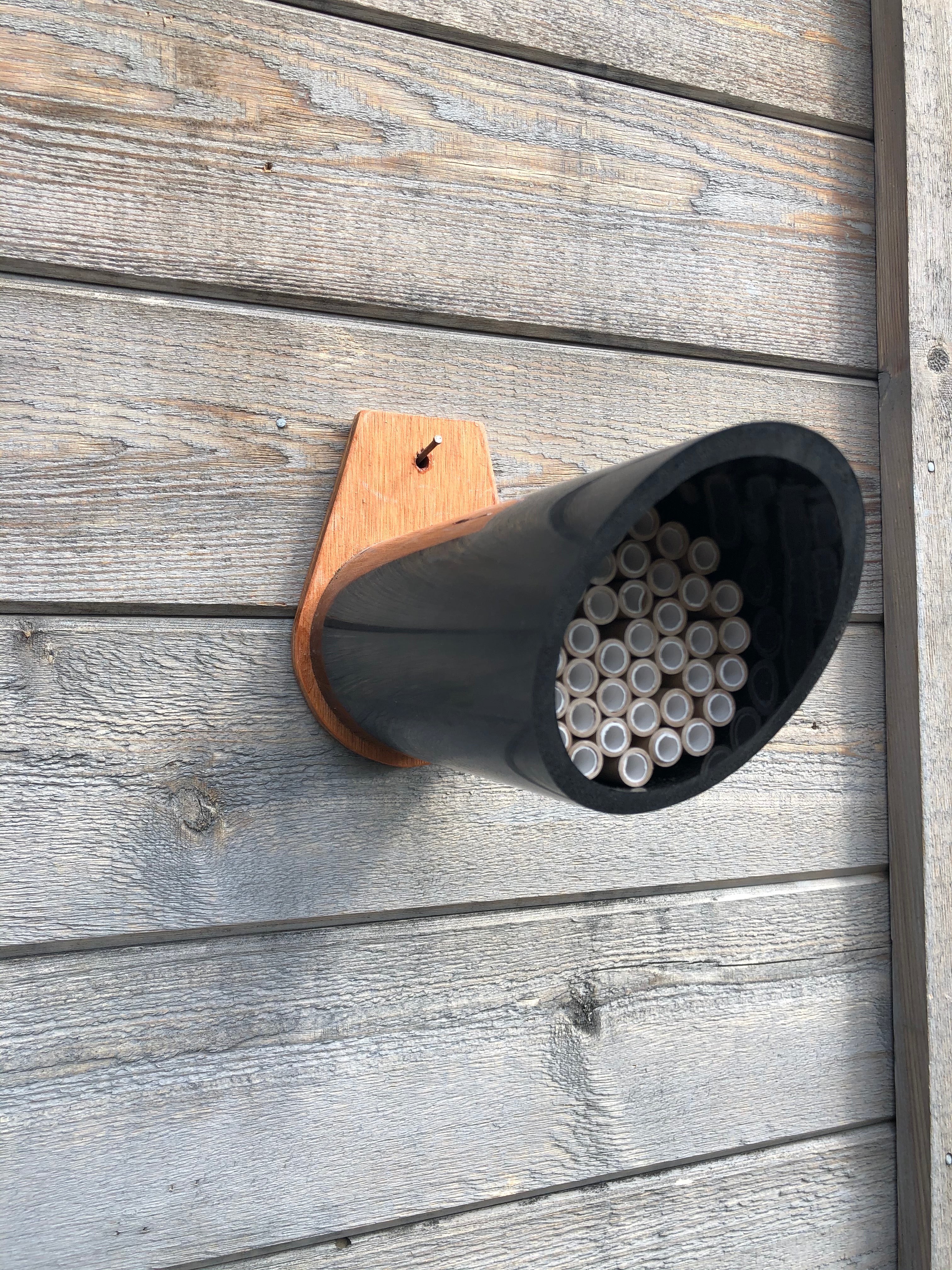 The Mason Bee House is a bundle of bamboo tubes that provide a place for mason bees to reproduce and gather pollen and nectar for their young. After laying eggs, the adults die, leaving a new generation to take over.
