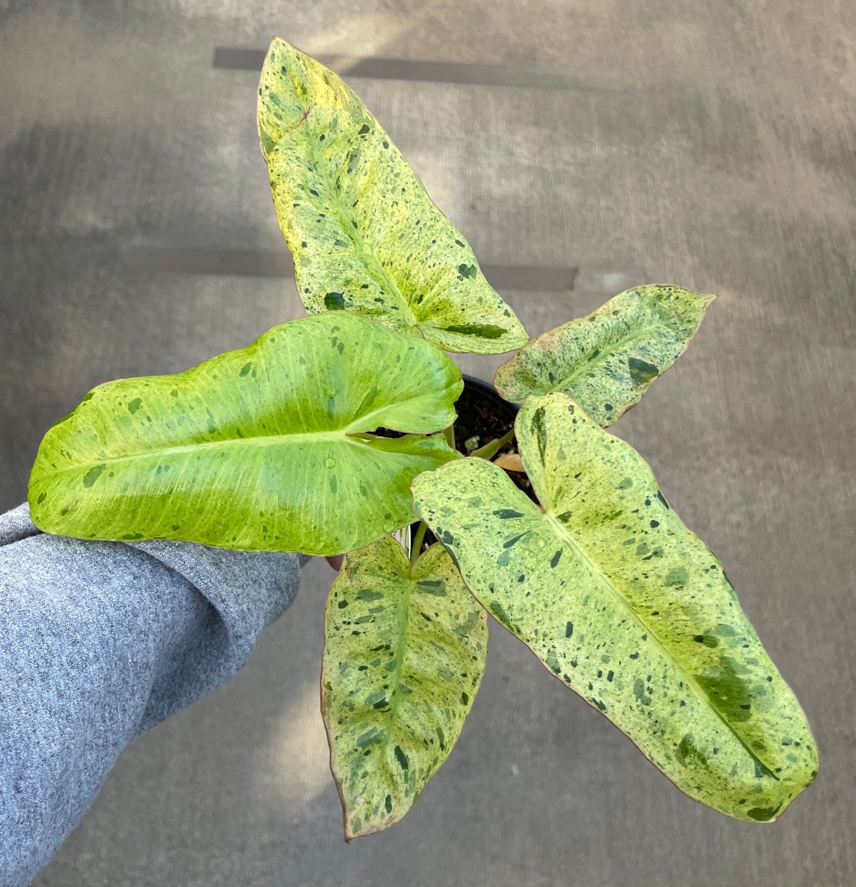 The Paraiso Verde Philodendron has elongated light green leaves with dark green speckled variegations that get more pronounced with more light/heat.